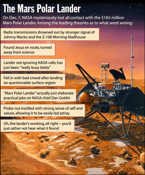 Recently, NASA just sent a 165 million dollar "Mars Polar Lander" to Mars. Supposedly, it was suposed to get samples, survey the area, and etc. However, it lost conection on December 7th.